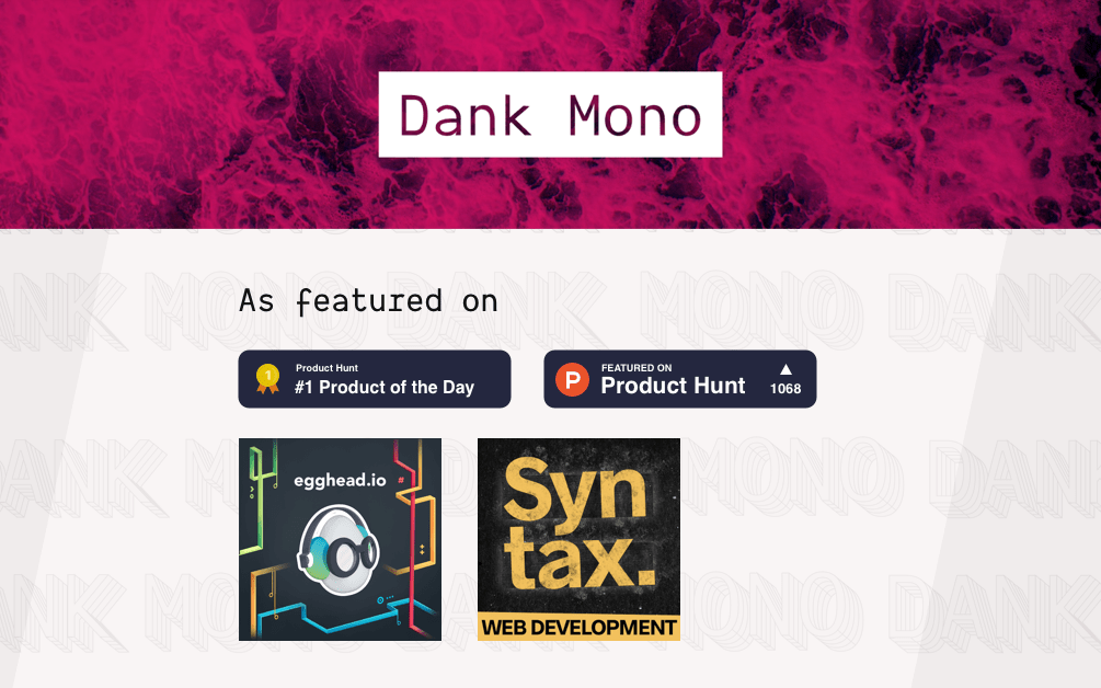 (Note: If you have purchased Dank Mono previously on dank.sh rather than Gumroad, please contact me personally at phil@dank.sh to retrieve an up-to-date version. E-mails are responded to in batches and I'll attempt to respond within 60 days.)